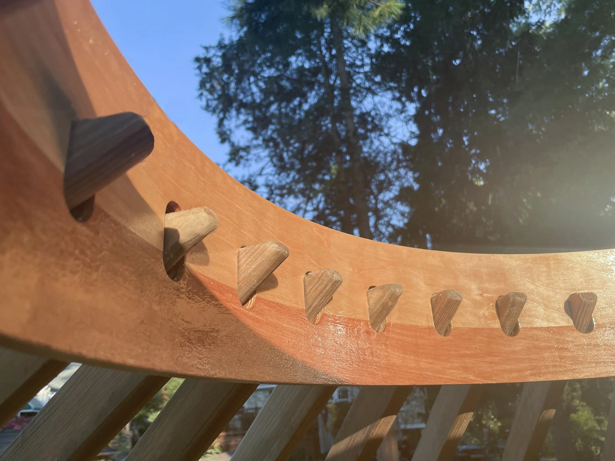 Engineered laminated hardwood: The roof ring is the structural and symbolic heart of the yurt - the element that everything else builds toward and around. Ours are built from multi-layer laminated hardwood, engineered for exceptional compressive strength, stability, and long-term reliability Each ring is then CNC-routed to exacting tolerances for rafter placement, ensuring consistency, load distribution, and ease of assembly. From there, we hand-finish every ring with multiple rounds of sanding and clear coat, building up a durable, refined surface that protects the wood and highlights its craftsmanship. The roof ring is where engineering and artistry meet — the piece that makes a yurt a yurt.